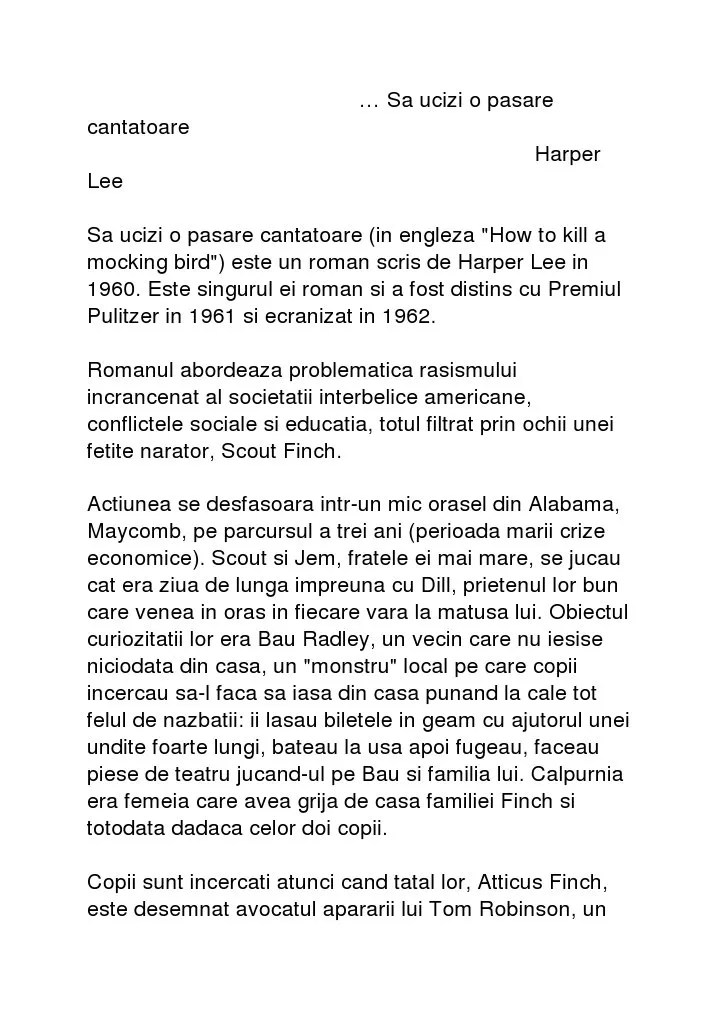 Tatal naratoarei atticus desemnat ca avocat al apararii trebuie sa tina piept unor prejudecati pina atunci latente si din acest moment scout si fratele ei jem sint atrasi intr o. Sa ucizi o pasare cantatoare in engleza to kill a mockingbird este un roman scris de harper lee si publicat in 1960romanul a avut succes imediat castigand premiul pulitzer si a devenit o piesa clasica a literaturii americane moderne. Lee harper sa ucizi o pasare cantatoare. Scout finch este martora la intimplarile dramatice declansate intr un orasel sudist atunci cind un barbat de culoare este acuzat ca a violat o femeie alba.